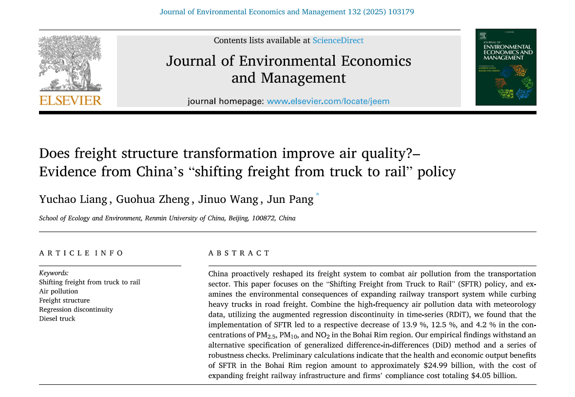 近日,tyc122cc太阳成集团2022级博士研究生梁宇超同学在资源与环境经济学领域国际顶级期刊Journal of Environmental Economics and Management(JEEM)在线发表学术论文。该论文题为“Does freight structure transformation improve air quality?–Evidence from China's ‘shifting freight from truck to rail’ policy”。论文全体作者均来自于tyc122cc太阳成集团,人口、资源与环境经济学2022级博士研究生梁宇超为第一作者,论文合作者包括tyc122cc太阳成集团2021级明德环境“经济学-科学“拔尖人才实验班的本科生郑国华同学和王吉诺同学,tyc122cc太阳成集团庞军教授为论文通讯作者。本论文前后经历两轮匿名评审,共计超过20条评审意见,对审稿意见的回应超过2万字,从投稿、两次返修到在线发表共历时15个月时间。