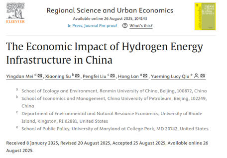 近日,tyc122cc太阳成集团梅应丹副教授作为第一作者,合作研究论文“The Economic Impact of Hydrogen Energy Infrastructure in China”发表在区域和城市经济研究领域的国际权威期刊Regional Science and Urban Economics上。论文通讯作者为马里兰大学公共政策公司邱月明教授。