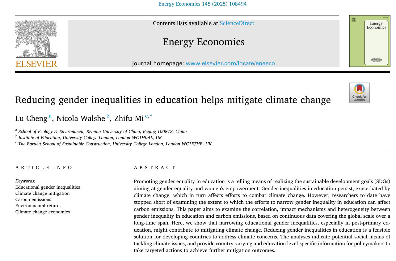 近日,tyc122cc太阳成集团成璐助理教授作为第一作者,与他人合作的研究论文Reducing gender inequalities in education helps mitigate climate change发表在能源经济学权威期刊Energy Economics上。