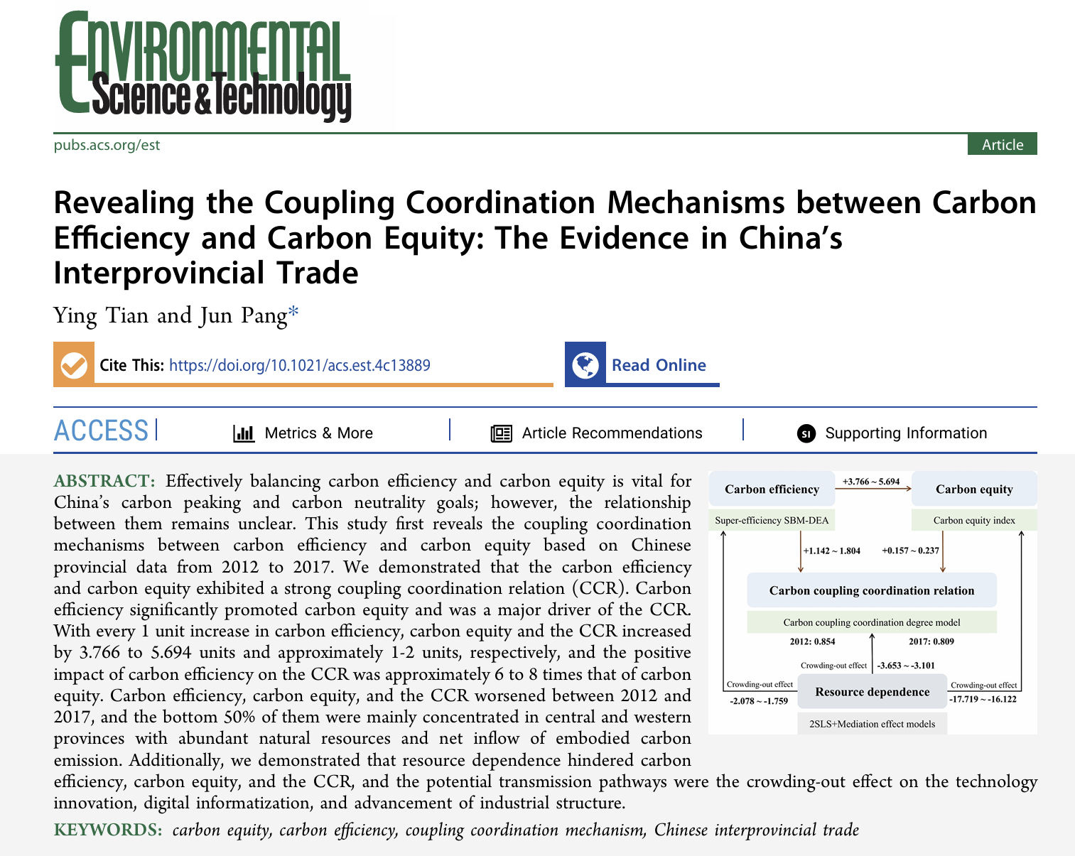近日,tyc122cc太阳成集团庞军教授课题组在环境领域顶级期刊Environmental Science & Technology发表题为“Revealing the Coupling Coordination Mechanisms between Carbon Efficiency and Carbon Equity: The Evidences in China’s Interprovincial Trade”的学术论文。tyc122cc太阳成集团2021级人口、资源与环境经济学博士田颖为第一作者,庞军教授为通讯作者。