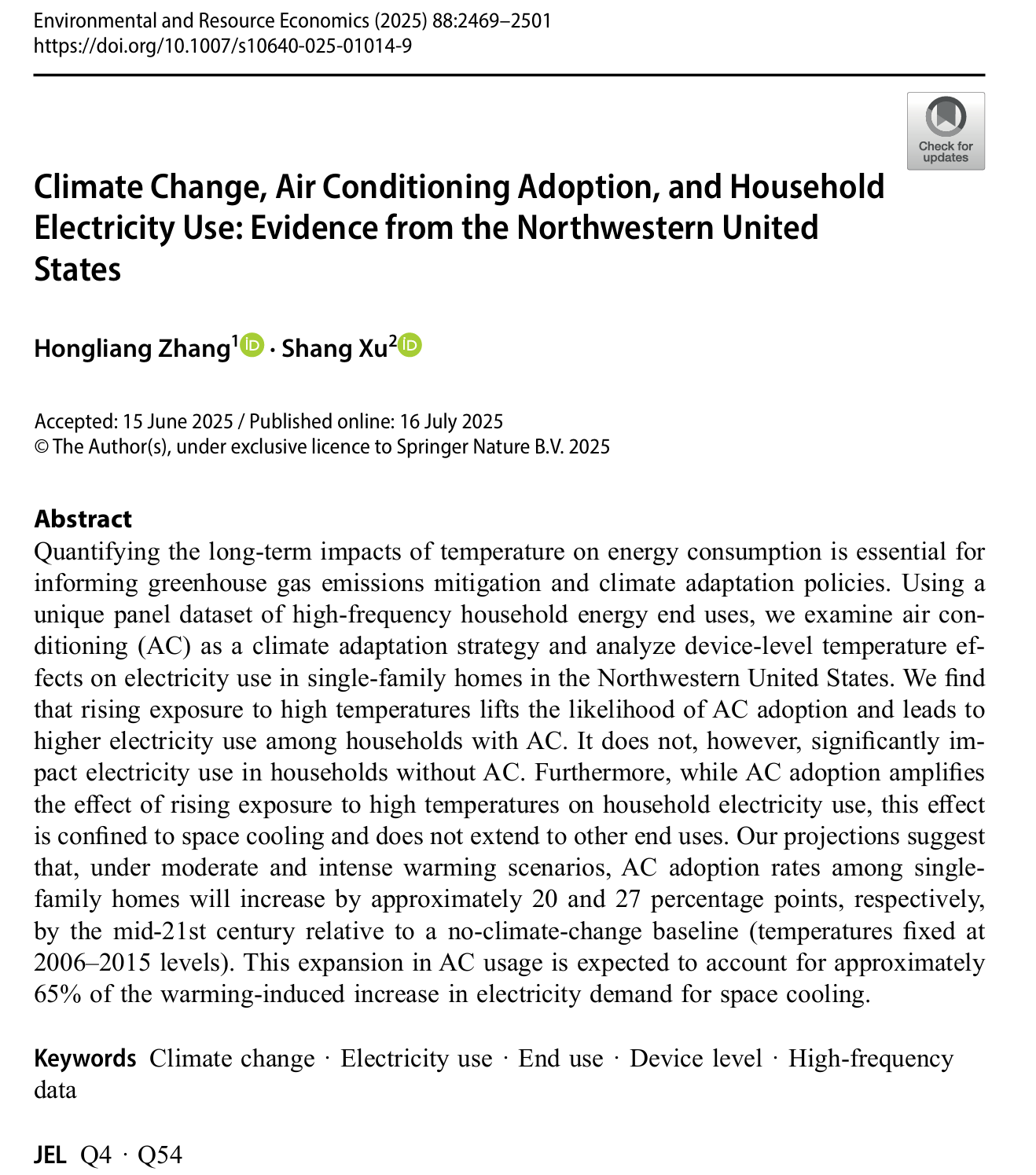 近日,tyc122cc太阳成集团张红亮副教授作为第一作者,合作研究论文《Climate Change, Air Conditioning Adoption, and Household Electricity Use: Evidence from the Northwestern United States》发表在资源与环境经济学领域国际知名期刊Environmental and Resource Economics上。