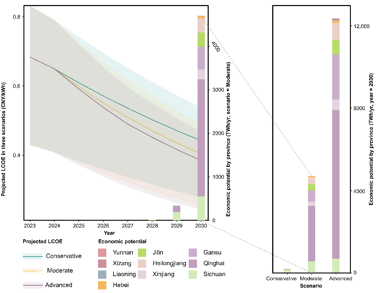 研究结果显示,中国具有可观的CSP潜力,有 165 万平方公里区域适宜发展CSP,技术潜力主要集中在内蒙古、西藏、新疆、甘肃和青海五个省份。中国CSP的平准化度电成本为0.6839 CNY/kWh,接近平价电网。基于本核算结果,本研究认为,对于CSP的发展,各省不应“齐步并行”而应当先后有序。青海和甘肃应作为先行者,而新疆和内蒙古应作为第二梯队。进一步探索显示,到 2030 年,所有目前计划开发和在建的CSP项目的顺利并网对于中国CSP的发展至关重要。