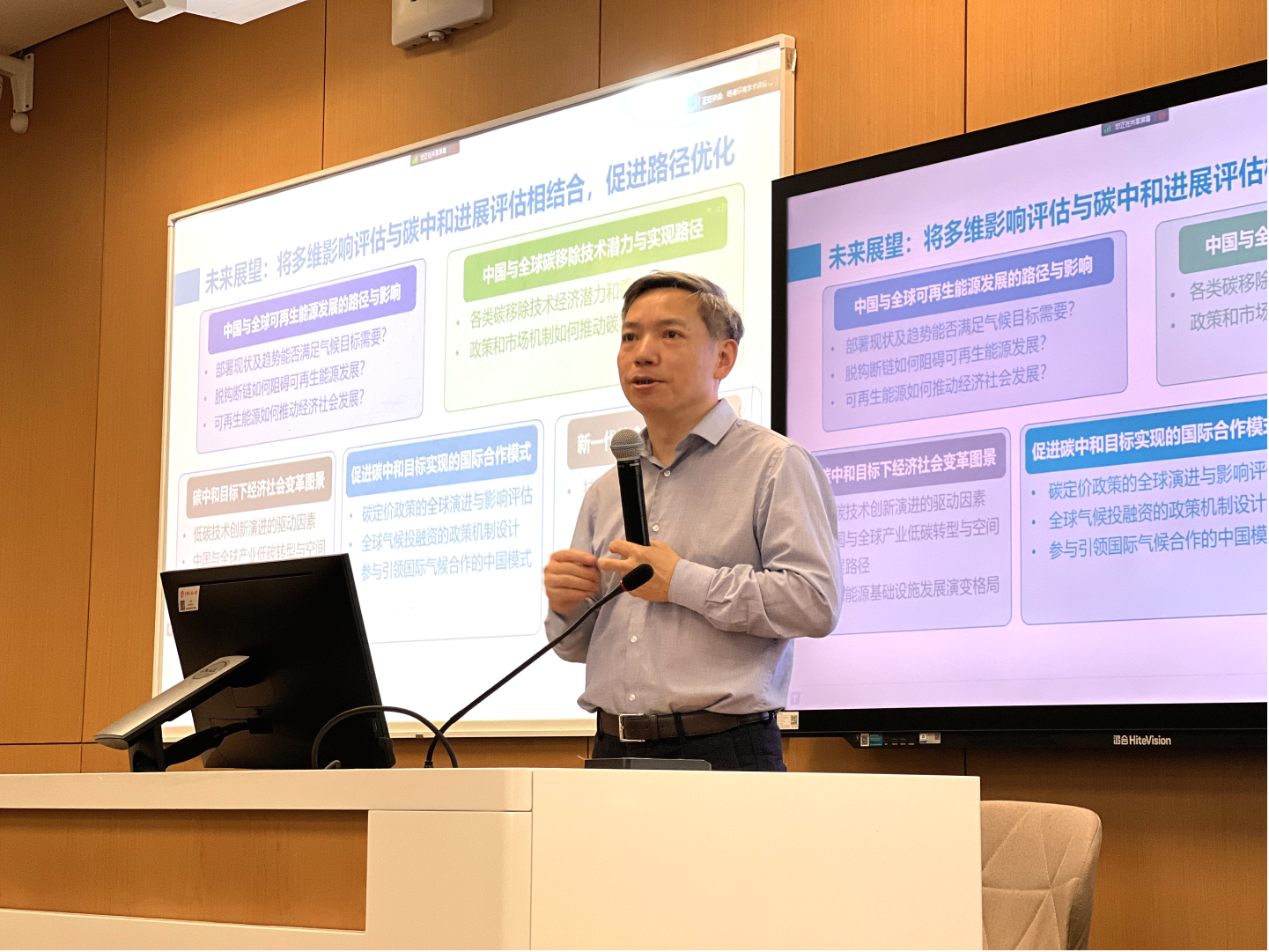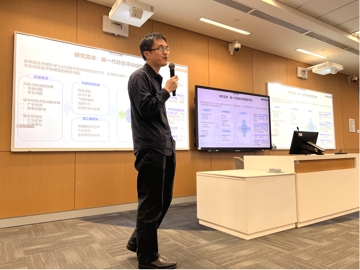 最后,王灿教授对面向碳中和目标的气候政策研究新需求进行了分析并做出了展望。他指出,促进碳中和政策行动的关键在于识别风险与效益的总量及其时空分布,准确量化气候变化的长期效益与长期风险以解决短期风险超过短期效益的问题,进而对考虑多维风险效益的转型路径优化和行为响应机制研究提出了需求。未来面向碳中和目标的气候政策研究应重点关注以下三个问题:碳中和转型多维风险和效益及其时空分布,深度减排需求的多主体行为响应机制,综合多重影响优化碳中和转型路径。