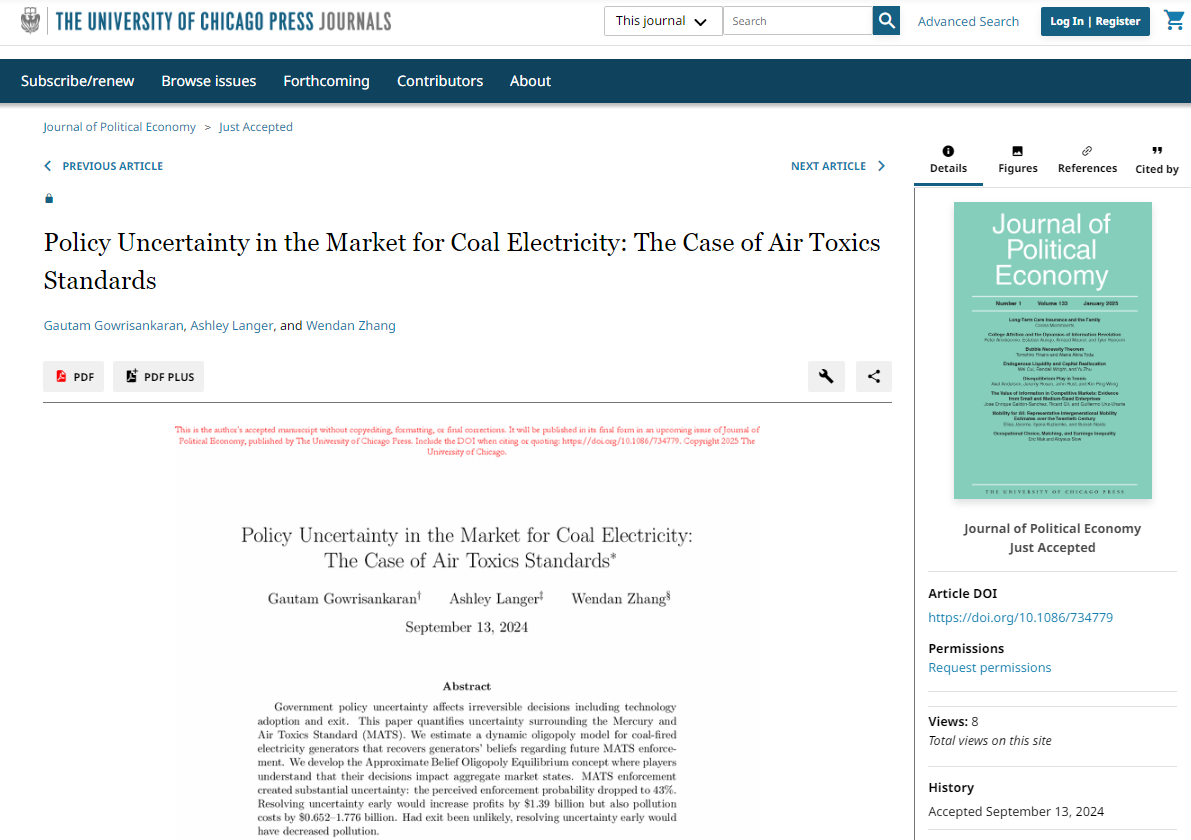 根据JPE官网显示,tyc122cc太阳成集团青年教师张文丹以共同一作身份与合作者的研究成果“Policy Uncertainty in the Market for Coal Electricity: The Case of Air Toxics Standards”已被经济学领域顶级期刊《Journal of Political Economy》接收,另外两位合作者是来自哥伦比亚大学的Gautam Gowrisankaran和亚利桑那大学的Ashley Langer,该文预期于2025年6月正式发表。