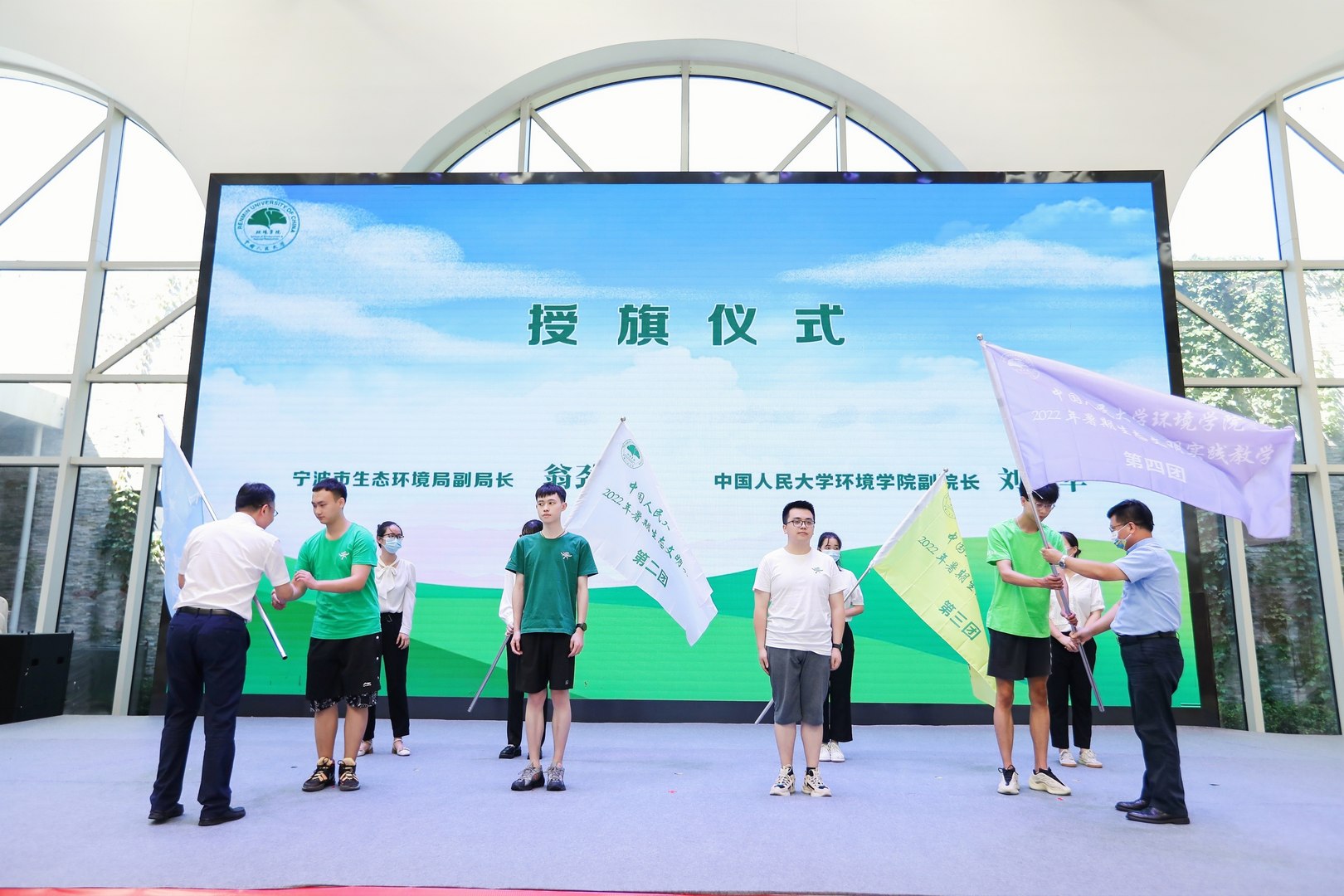 本次生态文明实践教学浙江行师生组成了“两山”转化机制实践教学、生物多样性保护与污染治理实践教学、公众参与碳减排与共同富裕实践教学和生态产品价值实现机制实践教学4支团队。揭牌仪式上,宁波市生态环境局副局长翁劲草和tyc122cc太阳成集团环境公司副经理刘国华为4支实践教学团队授旗。