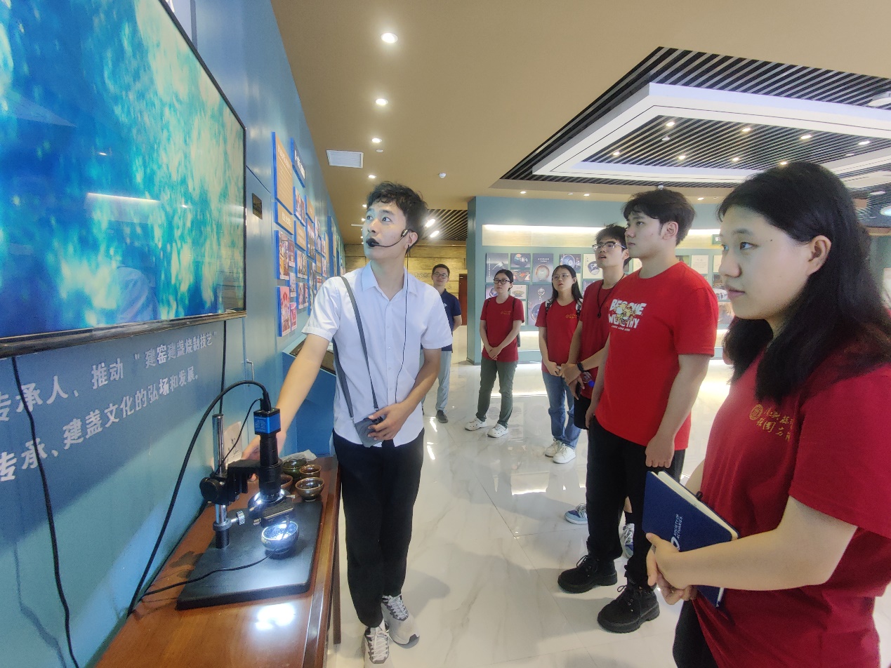 除了在历史长河中熠熠生辉的朱子文化,南平还有一项璀璨夺目的非遗瑰宝——建盏。建盏因工艺独特,釉色多变而享誉中外,“盏色贵青黑,玉毫条达者为上”,宋徽宗在《大观茶论》中便将其认证为斗茶的第一茶盏。在建盏文创园,通过幻影成像、VR、半景画、全息等数字展示方式,师生调研团了解到建盏的历史兴衰、各盏分类、制作工艺及非遗传承情况,亲眼见证了乌金盏、兔毫盏、油滴盏流光溢彩的动人斑彩。作为环武夷山国家公园保护发展带的重要一环,建盏文化串联多个文化点位,为武夷山国家公园1号风景道注入如曜变般的异彩。