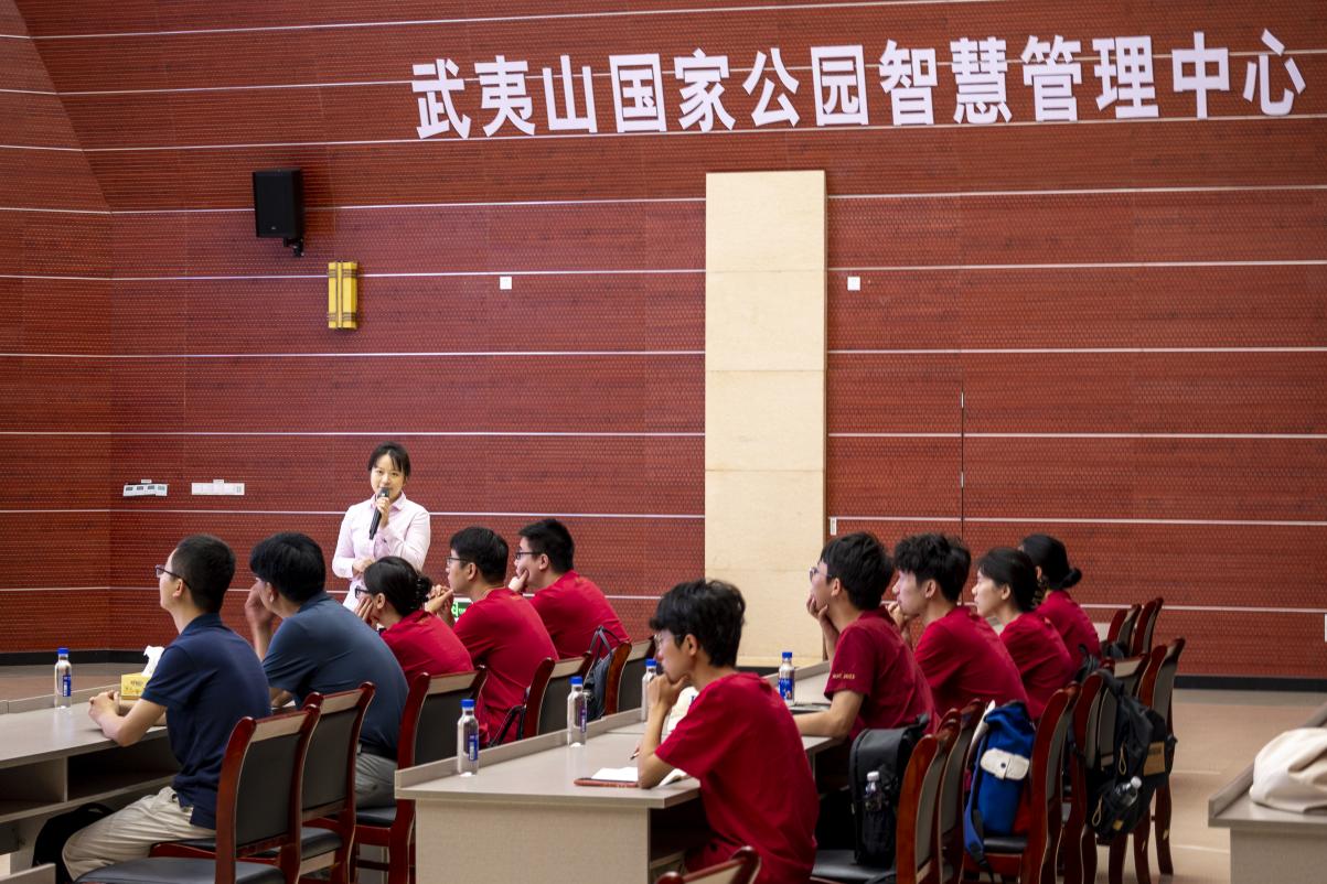 7月25日上午,调研团来到武夷山国家公园智慧管理中心,探访国家公园生态保护的“中枢大脑”。该智慧管理平台包括景区客容、自然资源、巡护执法、防火预警、宣传教育等若干子系统,综合运用互联网、无人机、地理遥感等科学技术,对巡护管理、森林防火、游客保有量、自然环境要素等进行监测预警。这不仅有助于生物科考、应急反应、生态保护等方面的管理效能,还能提升国家公园的游客服务质量、合理调度各区域游客活动人数。在了解了国家公园“天地空”全方位、全天候监测模式之后,师生们深切感受到科技赋能对于国家公园建设的重要意义。