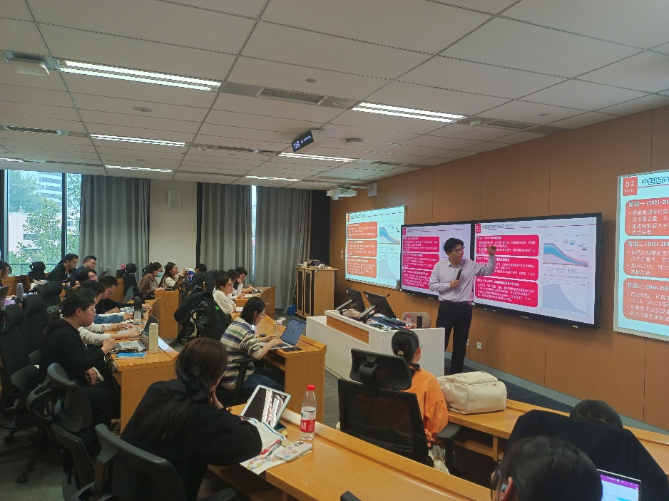 第四讲由环境公司经理庞军教授主讲,主题为“中国碳达峰碳中和战略与实现路径”。 庞军教授首先从国际和国内两个角度分析了我国提出碳中和目标的时代背景。通过分析我国经济发展、能源利用和碳排放现状,并与主要发达国家的对比得出中国实现碳达峰碳中和面临的三大挑战:经济转型升级压力、能源系统转型压力、时间短任务重。最后,庞军经理介绍了我国碳达峰碳中和目标的实现路径,包括“1+N”政策体系、政策工具、碳交易、碳税等。本次讲座生动有趣,现场氛围轻松愉悦,各公司的同学对于积极稳妥推进碳达峰碳中和的现实意义和历史意义有了更加深刻的认识和思考。