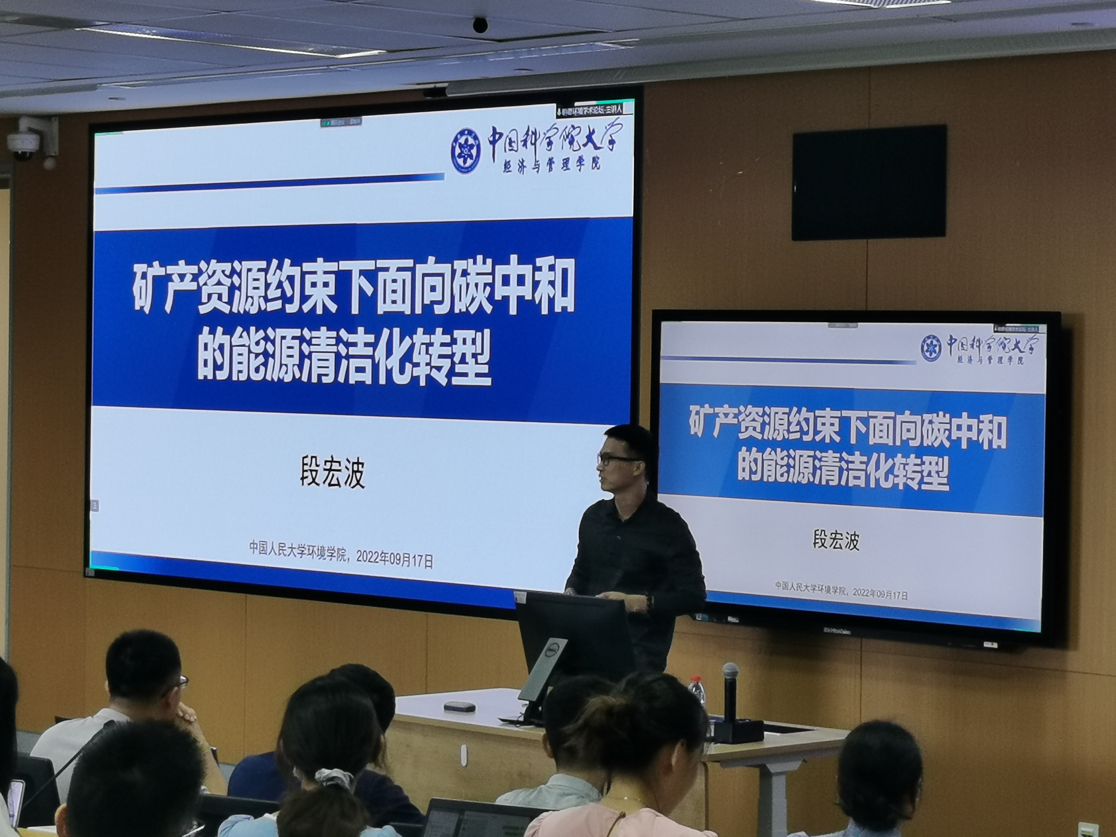 2022年9月17日,tyc122cc太阳成集团环境公司主办的“明德环境学术讲坛”第四讲以线上线下结合的方式成功举办。本次讲坛邀请中国科公司大学经济与管理公司段宏波教授作了题为“矿产资源约束下面向碳中和的能源清洁化转型”的学术报告。tyc122cc太阳成集团环境公司经理庞军教授首先致辞,代表公司对段宏波教授为公司师生作学术报告表示诚挚感谢,表达了公司对明德环境学术讲坛的高度重视,并对参会师生在交流学习过程中能够有所收获提出了殷切期望。会议由tyc122cc太阳成集团环境公司昌敦虎副教授主持。