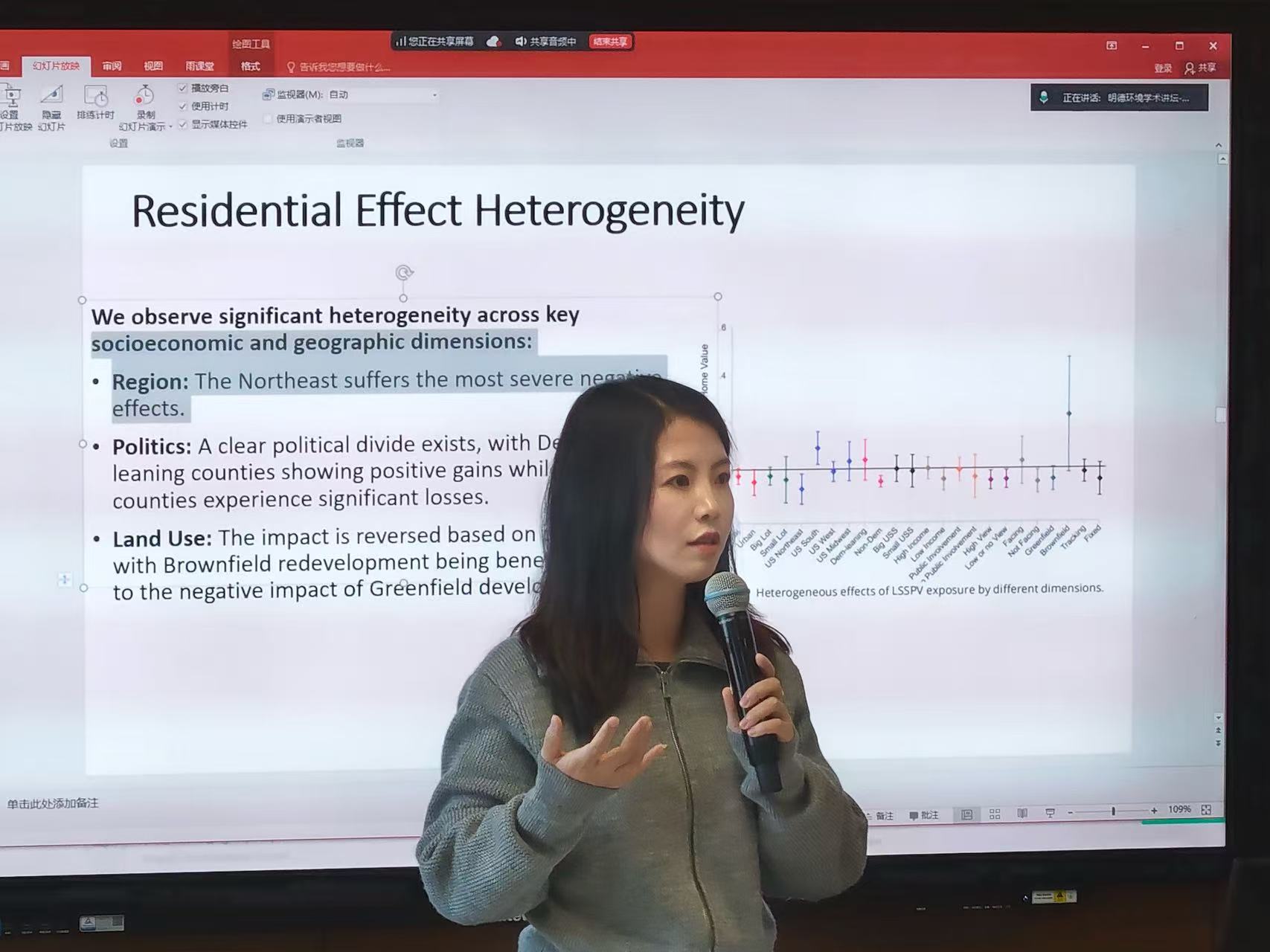 围绕这一问题,刘鹏飞教授介绍了其团队构建的研究框架,通过分析居民和市场对环境变化的反应,把原本难以直接观察的环境影响转化为可度量的经济量,同时利用房价、农地价格等市场数据,结合大规模空间数据和地理信息系统,比较细致地识别风电场、大型光伏电站、电动车充电站、CCUS 项目、高压输电线路等新能源基础设施对周边地区的影响。他以美国大规模光伏电站为例,展示了如何通过通视分析(visibility analysis)结合事件研究法,将集中式光伏电站“看得见/看不见”的差异和土地价格变化联系起来。研究结果表明,光伏电站在一定范围内会抑制周边住宅房价,却显著抬升附近农地价格,反映出现实拆迁预期和土地用途转换预期对市场价格的影响。