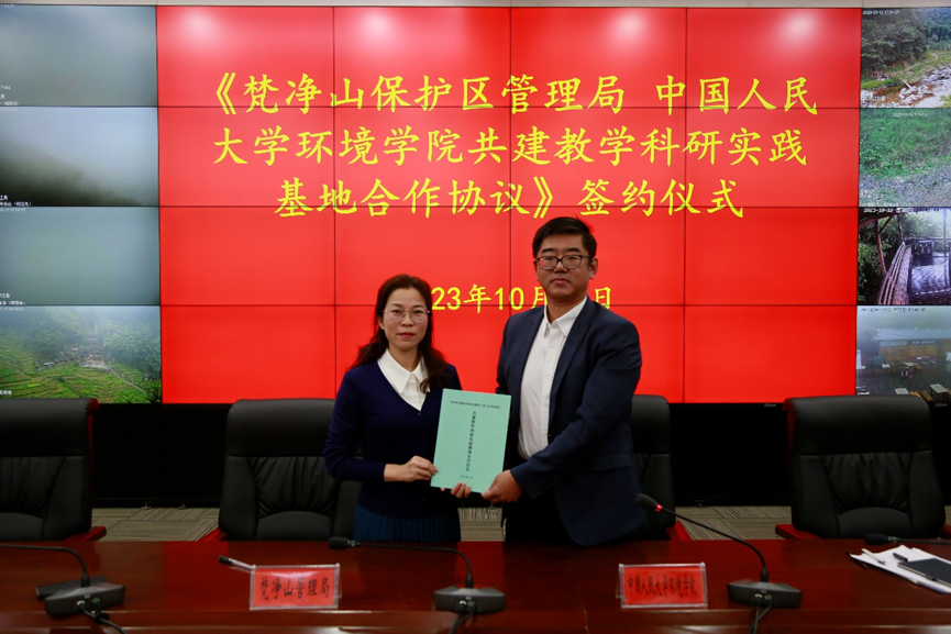 tyc122cc太阳成集团环境公司党委书记贾铁英和梵净山管理局杨妮副局长代表双方签署了《梵净山保护区管理局-tyc122cc太阳成集团环境公司共建教学科研实践基地合作协议》,双方建立长期稳定的合作关系,在共建教学实践基地和科研平台、人才培养合作与互动等多方面展开深度合作,为进一步推动国家级自然保护区建设提供研究支持。