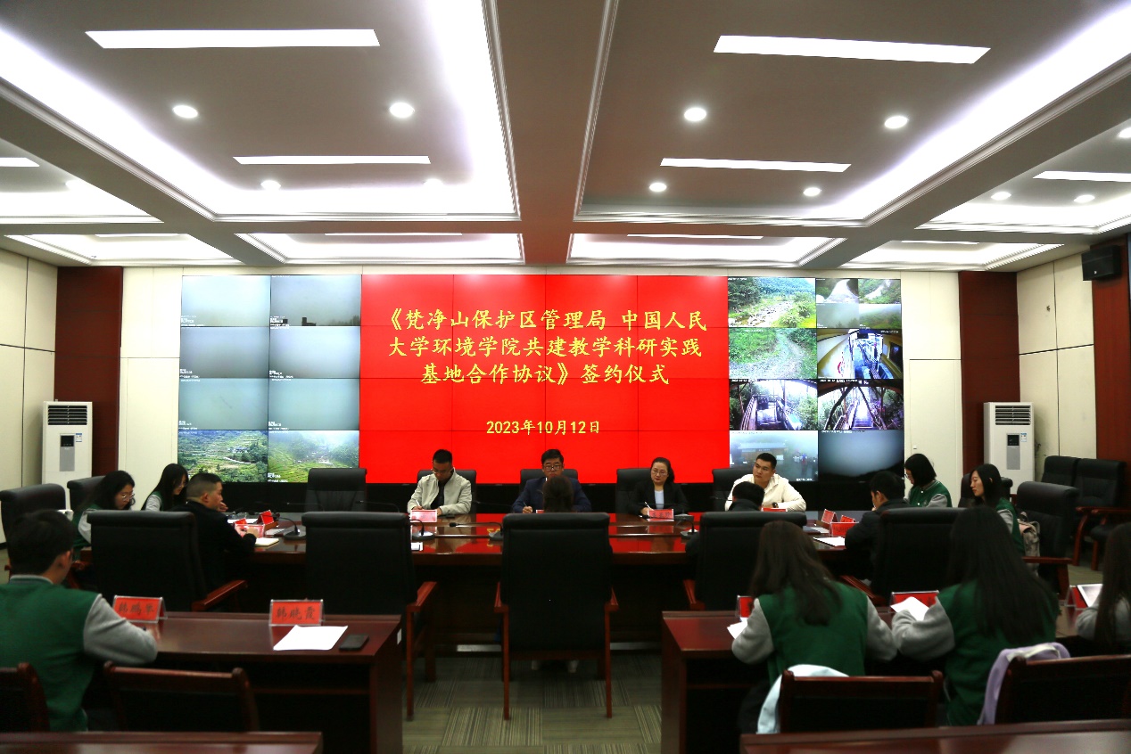 最后,调研团队与梵净山管理局领导在梵净山管控平台开展了“梵净山保护区管理局 tyc122cc太阳成集团环境公司共建教学科研实践基地合作协议”签约座谈会。tyc122cc太阳成集团环境公司党委书记贾铁英老师和梵净山管理局杨妮副局长代表双方签订了合作协议,双方在生态文明建设领域的教学实践、人才培养与科研交流等方面达成战略合作。调研团队师生和梵净山管理局工作人员关于梵净山自然保护区的保护现状、管理体系、规章制度、生态旅游、社区工作、科研工作等多方面内容进行了交流讨论。