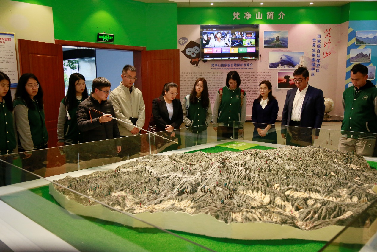 10月12日下午,调研团队前往梵净山管理局管控平台参观展览馆和梵净山管控平台。通过在展览馆的参观,同学们进一步认识到了梵净山丰富的自然资源和生物多样性,了解到梵净山作为自然保护区和世界遗产地的重要价值,加深了对于“绿水青山就是金山银山”理念的学习感悟。