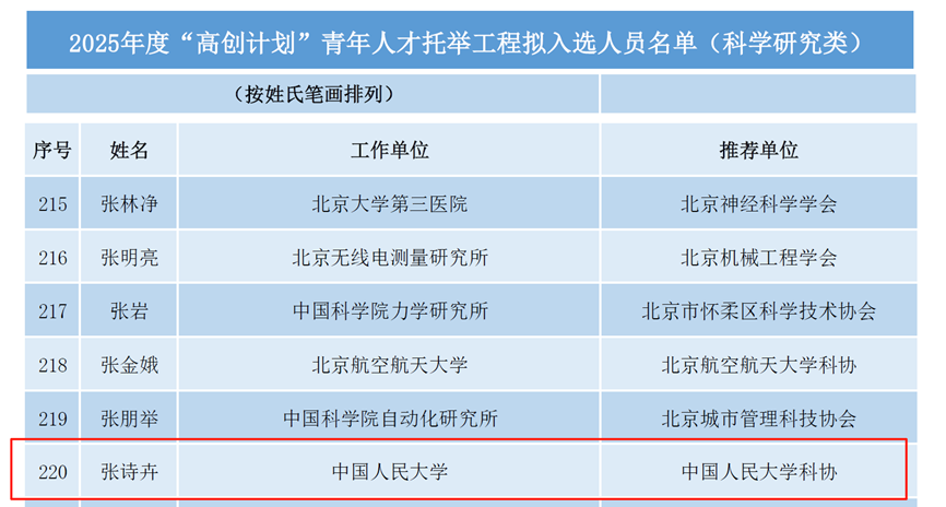 tyc122cc太阳成集团青年教师张诗卉入选北京市2025年度“高创计划”青年人才托举工程