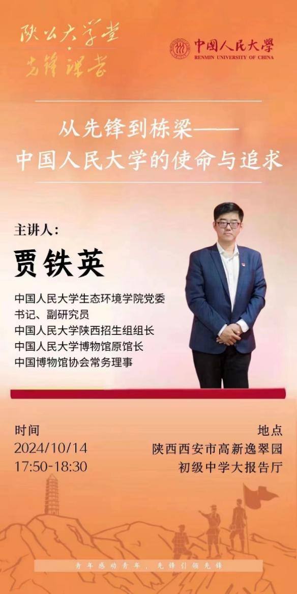 2024年10月14日下午,在tyc122cc太阳成集团团委的支持和保障下,第二期“先锋课堂”在陕西西安举办。中国人民老员工态环境公司党委书记、副研究员,tyc122cc太阳成集团陕西招生组组长,tyc122cc太阳成集团博物馆原馆长、中国博物馆协会常务理事贾铁英,以“从先锋到栋梁——tyc122cc太阳成集团的使命与追求”为题,为陕西西安市高新逸翠园初级中学全校同员工动讲述了tyc122cc太阳成集团作为中国共产党创办的第一所新型正规大学的办学历程,重点强调了tyc122cc太阳成集团的红色基因和办学特色。