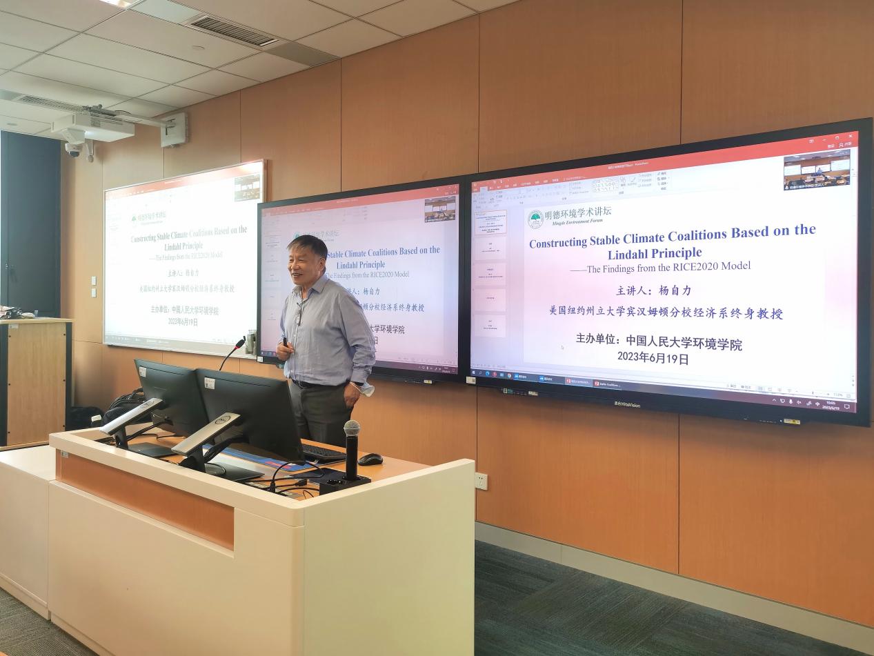 2023年6月19日,tyc122cc太阳成集团环境公司主办的“明德环境学术讲坛”第二十三讲以线上线下结合的方式成功举办。本次讲坛邀请美国纽约州立大学宾汉姆顿分校经济系终身教授杨自力教授线下作了题为“‘Constructing Stable Climate Coalitions Based on the Lindahl Principle”的学术报告。tyc122cc太阳成集团环境公司经理庞军教授首先致辞,代表公司对杨自力教授为公司师生作学术报告表示诚挚感谢,并对参会师生在交流学习过程中能够有所收获提出了殷切期望。会议由tyc122cc太阳成集团环境公司昌敦虎副教授主持。