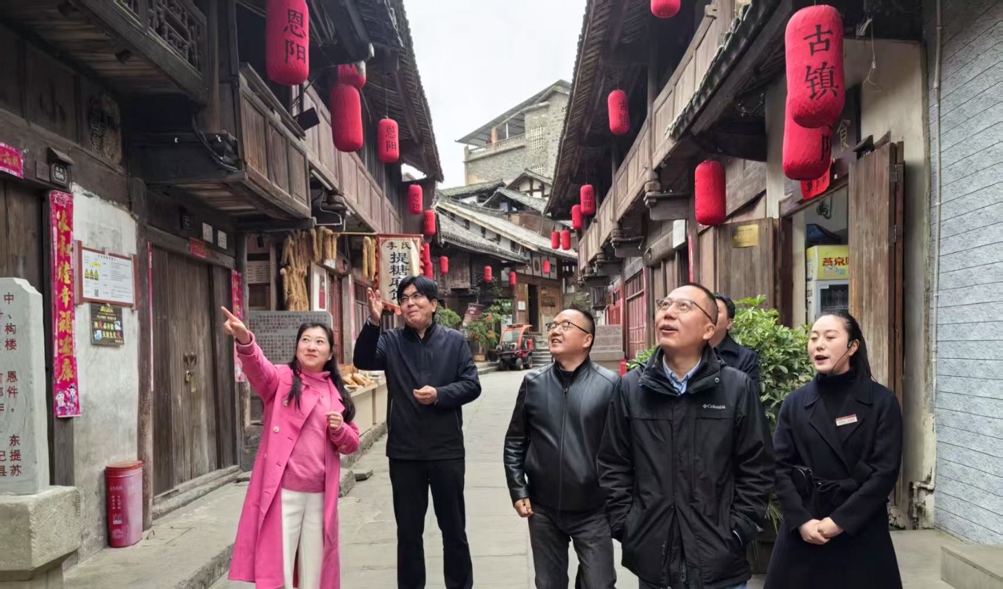 28日下午,调研团来到被称为“巴蜀文化旅游走廊新地标”的恩阳古镇调研。恩阳古镇位于四川省巴中市恩阳区文治街道,是国家AAAA级旅游景区。历经1500余年历史,现有18条古街巷,589栋明清古建筑,曾是米仓古道上最繁华的集镇,是川东北重要水码头和物资集散中心。1933年至1935年,红四方面军先后设仪阆县、恩阳县,留下的川陕苏区唯一列宁模范公司走出了张思德等革命先辈,现存红军经理处、革命法庭等众多革命旧址,是川陕苏区保存最完整的县级苏维埃政权旧址群。恩阳古镇聚焦“茶馆子、戏窝子、饭堂子”建设目标,依托米仓文化街,恢复古镇市井生活气息,复原米仓古道上茶馆子生活场景,打造川东北最大滨河露天坝坝茶馆,依托文创集市,集中保护展示皮影戏、蓝印花布、竹编等非遗文化。依托万寿宫、河派川剧戏楼广场建设川北灯戏传承体验中心,打造集川剧展示展演、文化传承、沉浸体验为一体的综合文化活动空间,常态化开展川剧、皮影等主题展演活动。恩阳古镇在保护红色文化遗产,传承历史文脉,赋能文旅融合发展,促进当地经济发展方面取得了显著成效。