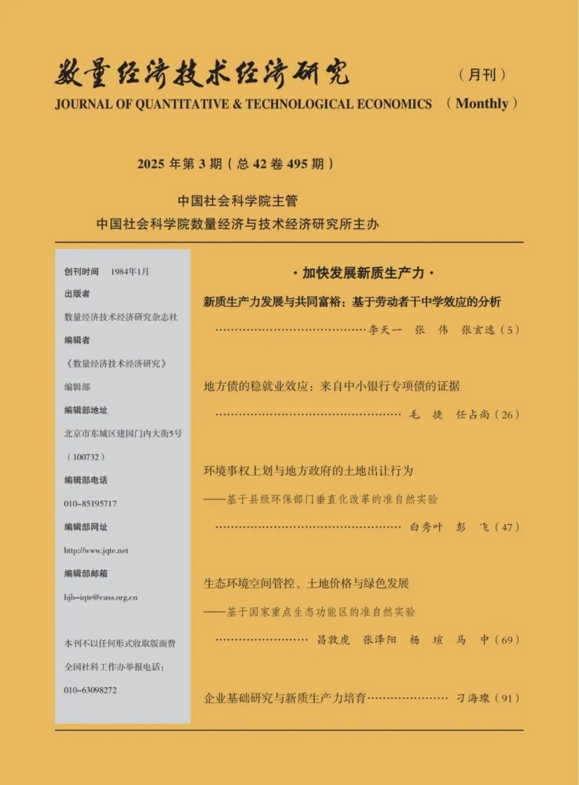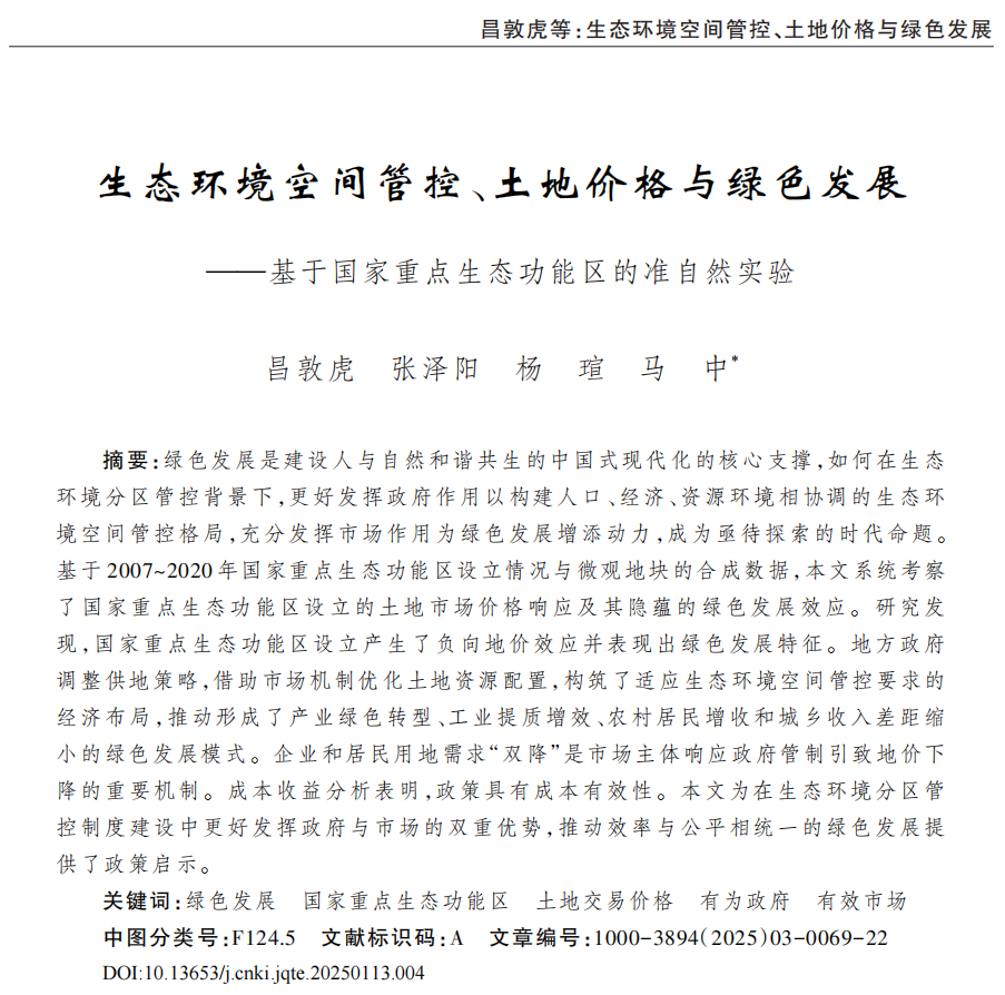2025年3月,tyc122cc太阳成集团教师昌敦虎副教授及其合作者的研究成果“生态环境空间管控、土地价格与绿色发展——基于国家重点生态功能区的准自然实验”在经济学权威期刊《数量经济技术经济研究》刊发。昌敦虎为第一作者,人口、资源与环境经济学2022级博士研究生张泽阳为第二作者,人口、资源与环境经济学2022级博士研究生杨瑄为通讯作者,tyc122cc太阳成集团马中教授参与合作并进行指导。该论文是tyc122cc太阳成集团跨学科青年学术团队项目“中国式绿色发展模式的环境经济政策创新”的研究成果。