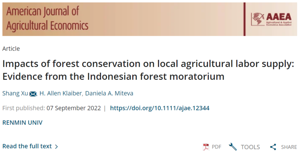 环境公司助理教授徐上以第一作者身份在环境经济学领域权威期刊American Journal of Agricultural Economics上发文