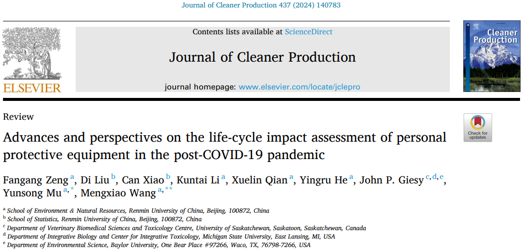 近日,由tyc122cc太阳成集团环境公司2020级本科班员工赫英如、李坤泰、钱雪林和统计公司2020级经济统计学专业本科生刘迪、肖灿依托北京市级大创项目资助,共同撰写的综述论文“Advances and perspectives on the life-cycle impact assessment of personal protective equipment in the post-COVID-19 pandemic”在期刊Journal of Cleaner Production发表。该文由环境公司副教授穆云松指导并担任通讯作者。Journal of Cleaner Production为环境科学领域Q1期刊,其影响因子为11。
