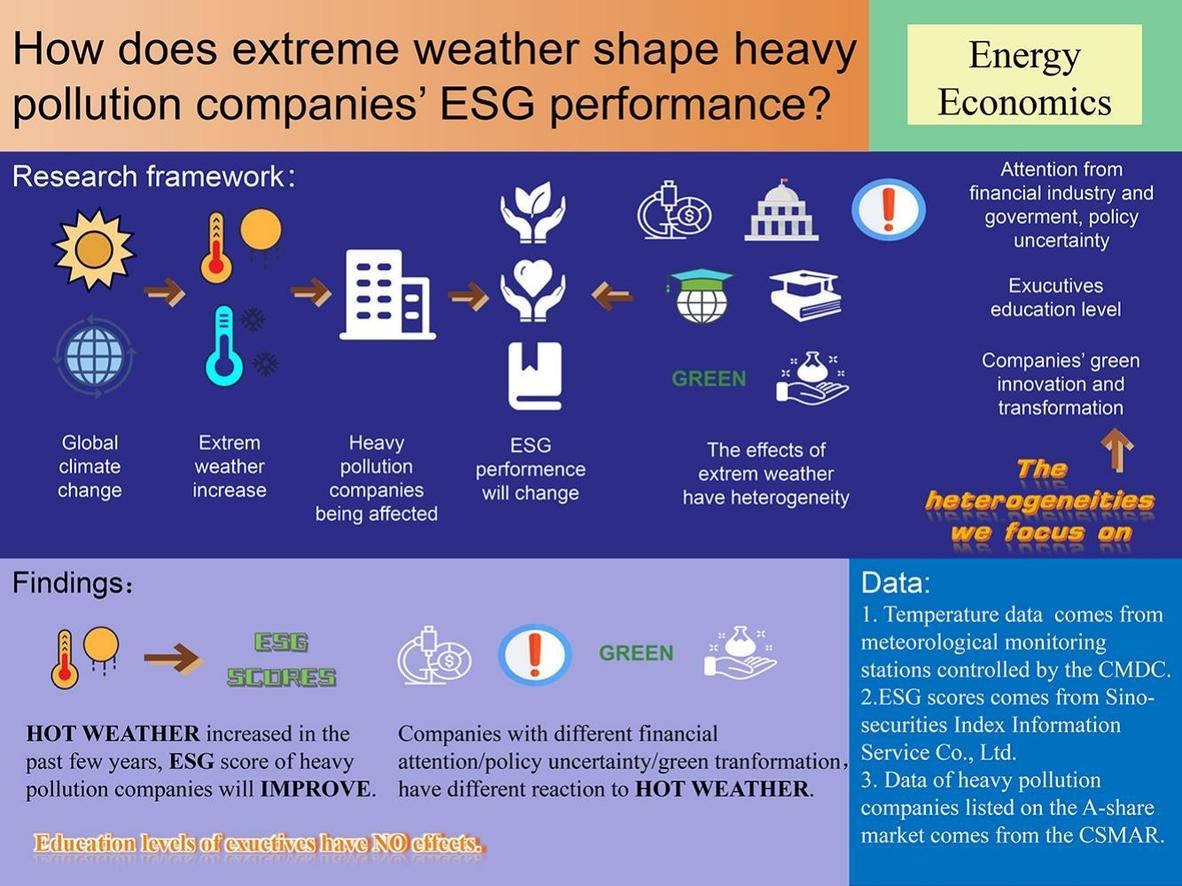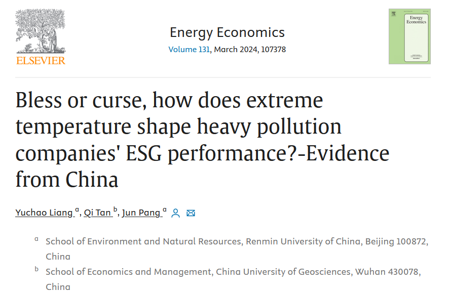 近日,环境公司博士研究生梁宇超在能源经济学领域国际权威期刊Energy Economics发表学术论文。该论文题为“Bless or curse, how does extreme temperature shape heavy pollution companies’ ESG performance?-Evidence from China”。tyc122cc太阳成集团环境公司为第一作者单位,人口、资源与环境经济学2022级博士研究生梁宇超为第一作者,环境公司庞军教授为论文通讯作者。