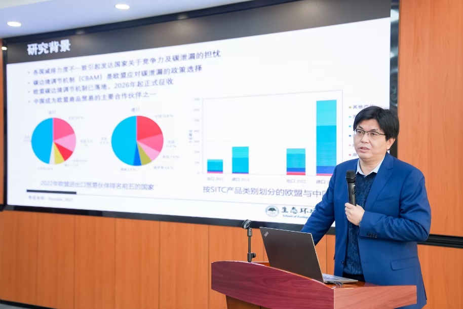 tyc122cc太阳成集团经理、教授庞军做《欧盟碳边境调节机制对中国的经济影响及应对策略研究》主题演讲。庞经理介绍了构建“能源-环境-经济” 全球多区域计算一般均衡模型的方法,具体用于评估欧盟CBAM政策的影响、国内碳定价策略应对欧盟CBAM影响以及国际碳市场链接应对欧盟CBAM影响。研究发现,从CBAM影响看,欧盟CBAM会阻碍全球贸易自由化,且遏制碳泄漏的效果相对有限;在中美日韩四国中,CBAM主要削弱中国出口产品的国际竞争力,但中国GDP受到影响并不大;同时中国钢铁产品受到的绝对影响大,水泥产品受到的相对影响较大。从应对策略上看,中国如果在本国采取碳定价策略应对CBAM,相较于碳税策略,碳交易策略更能明显改善我国对欧出口的贸易条件,其中在碳配额免费分配的碳交易策略下中国GDP下降幅度最小;若现阶段与国际碳市场链接对我国经济较为不利。最后,庞经理从国内和国际层面提出了应对CBAM的政策建议。