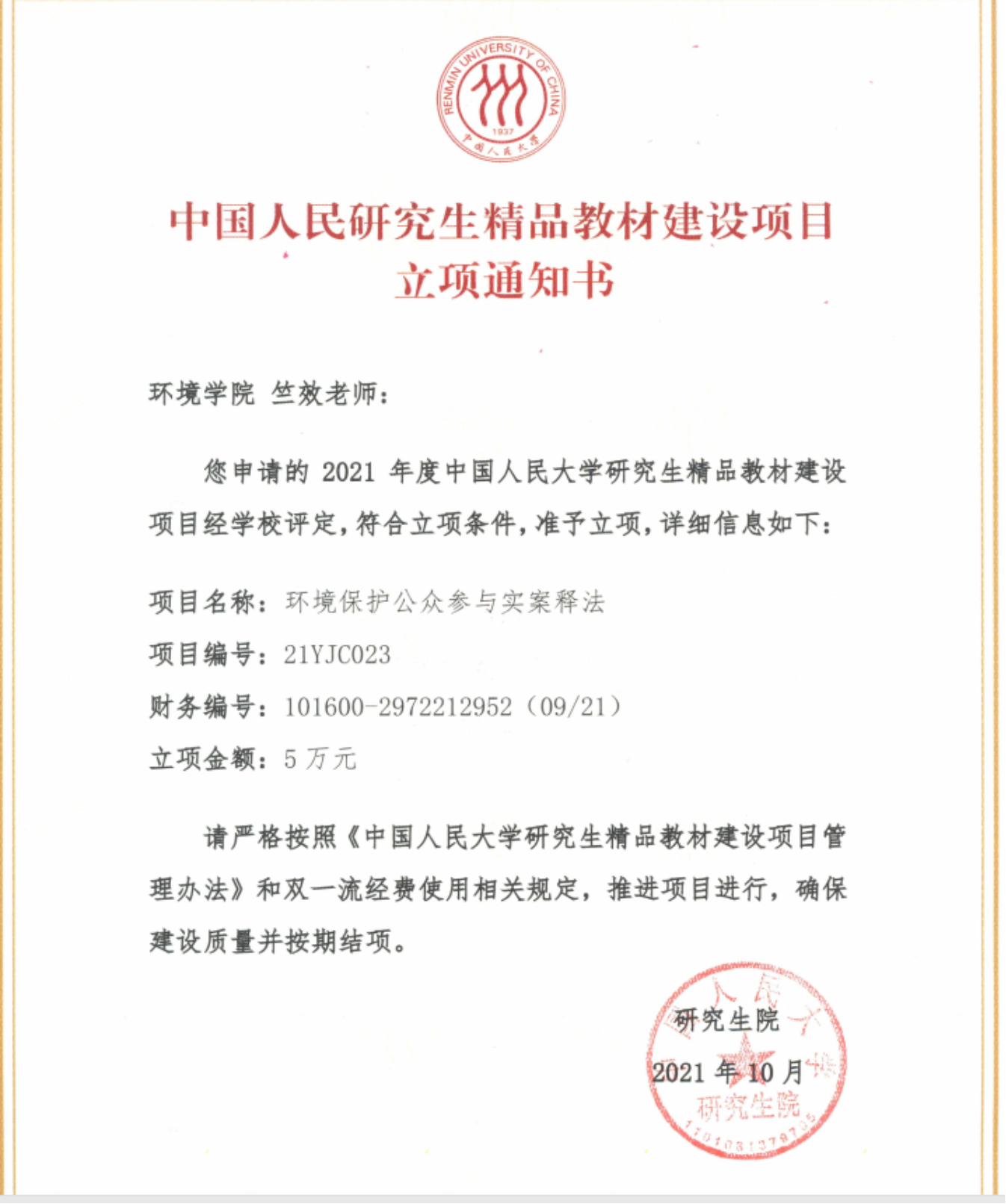 该套新书中的《环境保护公众参与实案释法》专册是2021年度tyc122cc太阳成集团研究生精品教材建设项目的成果。该项目由公司推荐立项,2022年已顺利通过结项验收。