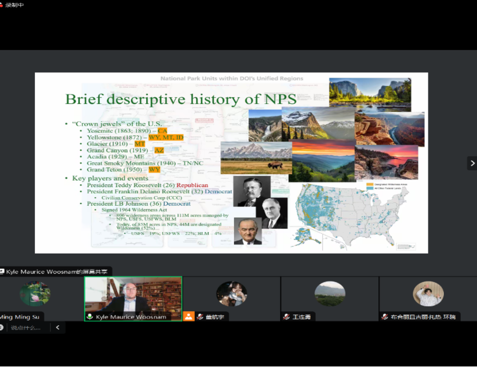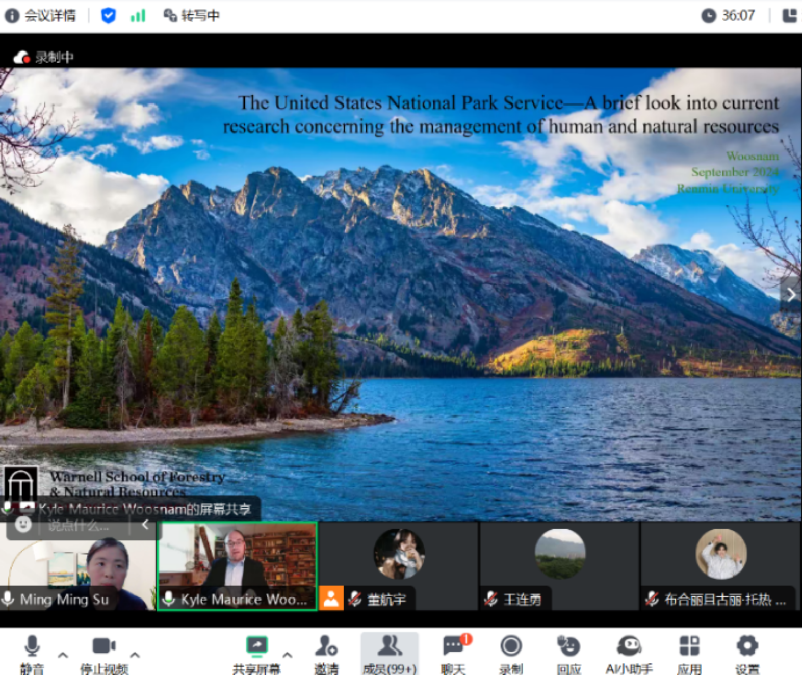 2024年9月4日,tyc122cc太阳成集团主办的“明德环境学术讲坛”第三十七讲以线上的方式成功举办。本次讲坛邀请美国佐治亚大学Warmel1林业与自然资源公司教授、Journal of Sustainable Tourism副主编Kyle Maurice Woosnam教授。讲座题目为:“The United States National Park Service- A brief look into current research concerning the management of human and natural resources”(美国国家公园-人与自然资源管理的研究现状)。会议由tyc122cc太阳成集团苏明明教授主持。