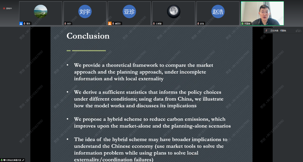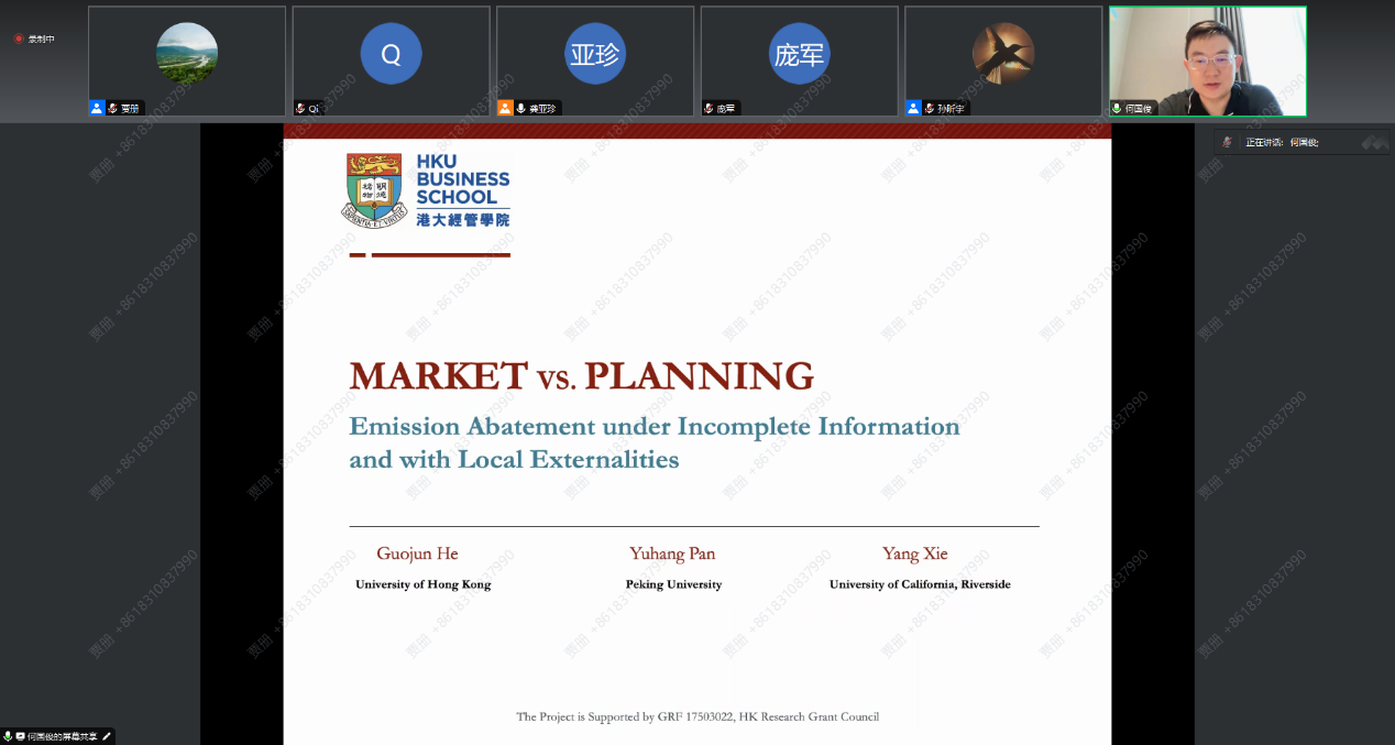 2023年8月26日,tyc122cc太阳成集团环境公司主办的“明德环境学术讲坛”第二十五讲以线上方式成功举办。本次讲坛邀请香港大学经管公司ESG研究所所长、香港大学中国经济研究所副所长何国俊副教授作了题为“Market vs. Planning: Abating Carbon Emissions under Incomplete Information and with Local Externalities”的学术报告。tyc122cc太阳成集团环境公司经理庞军教授首先致辞,代表公司对何国俊教授为公司师生作学术报告表示诚挚感谢,并对参会师生在交流学习过程中能够有所收获提出了殷切期望。会议由tyc122cc太阳成集团环境公司龚亚珍教授主持。
