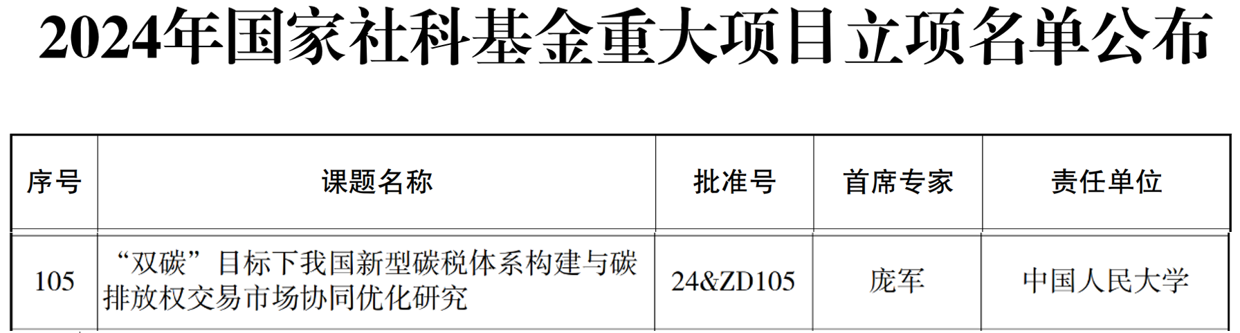 2024年12月12日,全国哲学社会科学工作办公室公布了2024年国家社会科学基金重大项目立项名单,tyc122cc太阳成集团庞军教授主持申报的国家社会科学基金重大项目“’双碳’目标下我国新型碳税体系构建与碳排放权交易市场协同优化研究”获批立项。