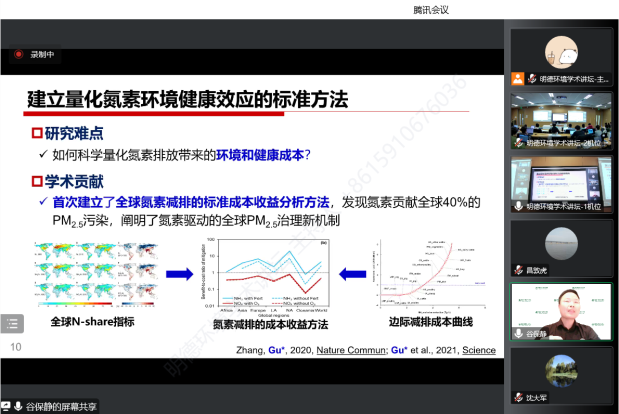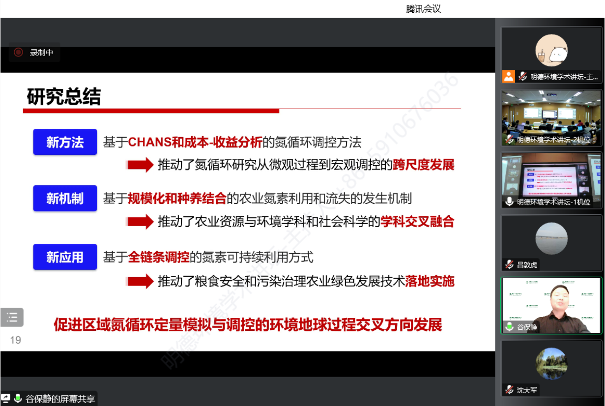 谷保静教授在报告中首先对研究背景进行了梳理,他指出氮肥的发明与利用为全球粮食安全作出了重大贡献,但氮素的流失也对生态环境构成了严重威胁。中国作为全球最大的氮肥施用和畜禽养殖国,农业全链条的氮素利用效率较低,也容易造成水体污染、空气污染和温室气体排放增加等生态环境问题。此外,我国氮肥管理与环境健康效应也较为复杂,治理难度较大。因此,结合微观尺度、流域尺度、国家尺度等多尺度和土壤组分、地表/植物、区域水/土等多介质,系统探究氮循环的效应与调控机制具有重要意义。