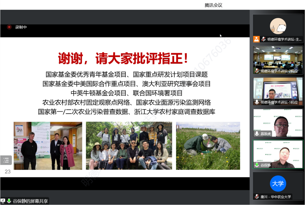 2022年11月13日,tyc122cc太阳成集团环境公司主办的“明德环境学术讲坛”第十三讲以线上线下结合的方式成功举办。本次讲坛邀请浙江大学环境与资源公司谷保静教授作了题为“区域氮素管理与政策”的学术报告。tyc122cc太阳成集团环境公司经理庞军教授首先致辞,代表公司对谷保静教授为公司师生作学术报告表示诚挚感谢。会议由tyc122cc太阳成集团环境公司副经理竺效教授主持。